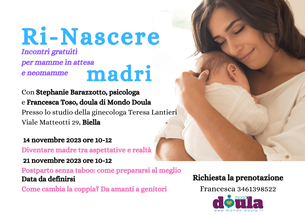 Felice di condividere con voi la locandina del ciclo di incontri gratuiti “Ri-Nascere madri” condotti da me, doula di Mondo Doula e educatrice perinatale MIPA Formazione in formazione, insieme alla Psicologa e Sessuologa Biella Dott.ssa Stephanie Barazzotto.